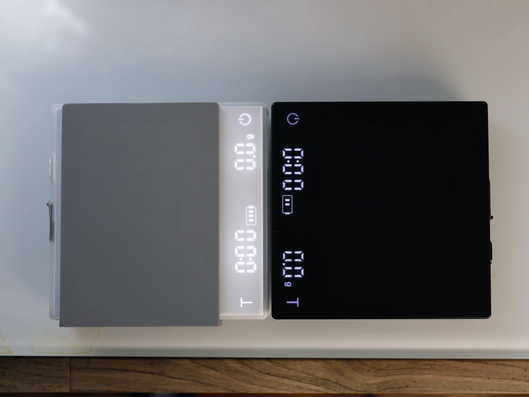 This means that the right side power button still controls zeroing out the scale (a few milliseconds’ press will do it), and long pressing it will power off the scale. The T button, moved to the left, starts and pauses the timer. A long press (around 1-2 seconds) will zero the timer out.