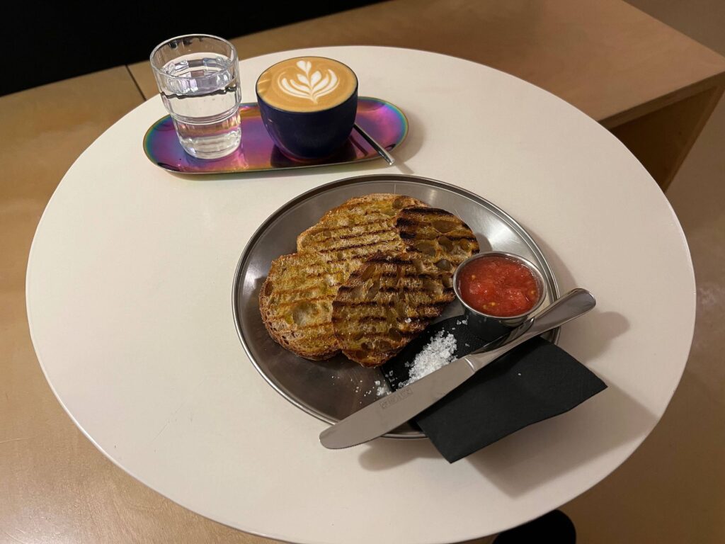 I could smell my approaching breakfast as the aroma wafted towards me preceding the barista as she walked around the corner of the coffee bar and hand delivered my coffee and plate of toast. The cappuccino, expertly poured sat on its own tray with a glass of peligrino gently fizzing nearby inviting me to inhale its nutty aroma, the floral heart latte art smooth and silky, a stark contrast to the rainbow design of the serving dish. The toast, expertly grilled and crispy warmed the metallic serving plate and carried hints of cereal and that “baked bread” aroma that always seems to make anyone feel like they were home, no matter where they found themselves in the world.