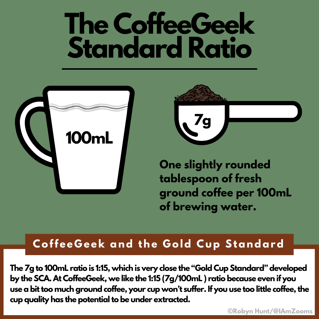 At CoffeeGeek, we recommend 7g of coffee (one slightly rounded tablespoon) per 100mL (100g) of water for automatic drip brewers and pour overs. You can adjust the water amount based on personal preference.