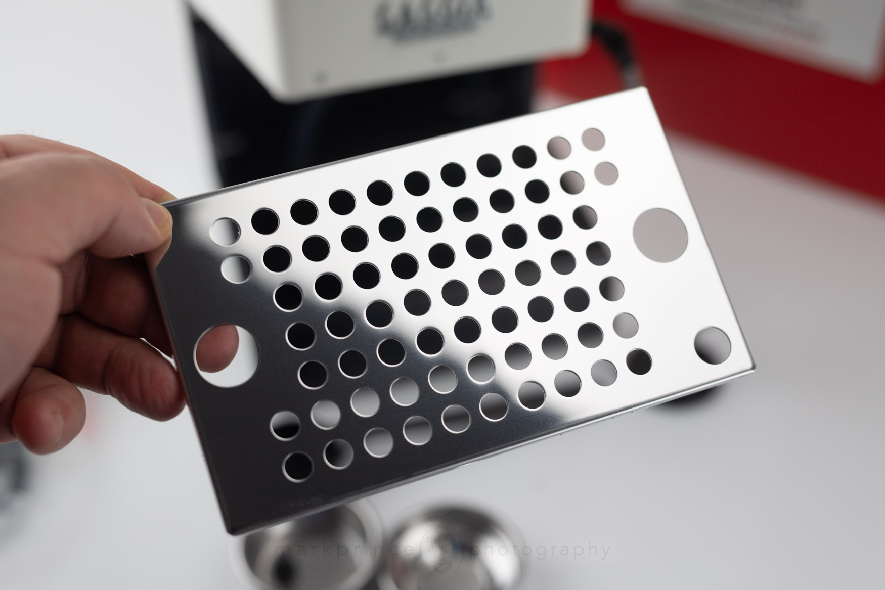Moving further down in front you come to the drip tray which hasn’t changed since the 2019 model. It is still made of plastic with a steel perforated top plate (removable) and still holds a fair amount of liquid before needing to be emptied. This is both a good and bad thing. Good in that it holds a lot of liquid. Bad in that the cup clearance between the spouted portafilter and drip tray is really low. The good news is, relatively cheap low-profile drip tray replacements (that fit the Gaggia perforated steel top plate) can be found on Etsy for $20 or less.