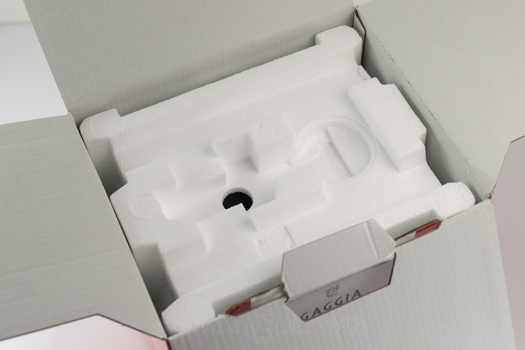 Opening up Gaggia’s shiny red and white box, you find the instruction manual on top, with the first layer of styrofoam protection. Remove these, and the machine is visible. Kudos to Gaggia for not wrapping the entire machine in another layer of plastic bags.