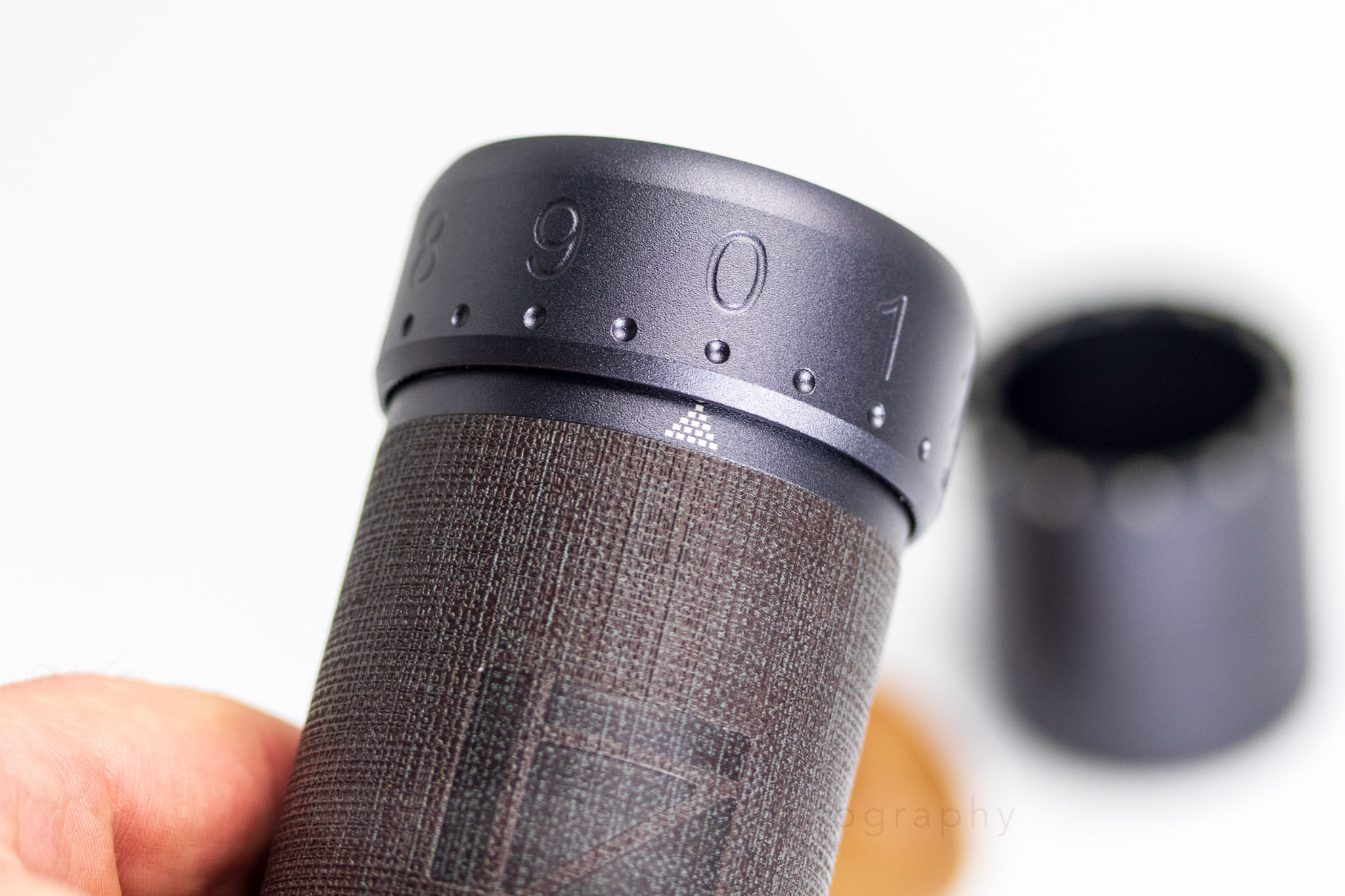 The external grind adjustment dial is one of the defining features of the X‑Ultra. It comes factory‑set at zero, with numerals and hash marks clearly embossed. Each full rotation provides 60 clicks, with every click moving the burrs by 12.5 microns. That puts it in the sweet spot for both espresso and filter brewing: fine enough for meaningful espresso adjustments, coarse enough that pour over settings don’t require endless clicks. Under good light, the embossed markings are easy to see, but in dim conditions you may find yourself tilting the grinder to catch the right angle. One thing I wish it had is an indicator for tracking full rotations, as found on grinders like the J-Ultra, or Blade R3 from MHW‑3Bomber.