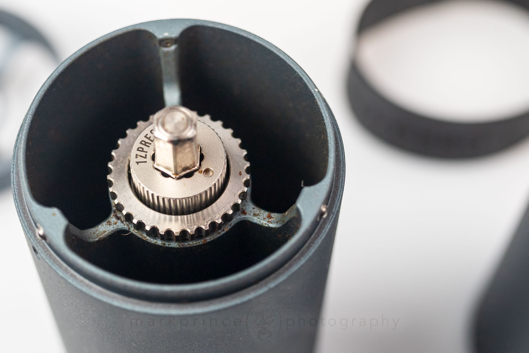 Re‑calibrating the dial after a deep clean is easy too. Pop off the numbered ring, realign it to zero, and you are back in business. The included brush and blower handle routine cleaning duties well. Just remember the big rule: no water. A sticker inside the grinder itself reminds you that moisture can spell trouble for the burrs and bearings, which is why the Ross Droplet Technique (RDT, lightly misting beans to reduce static) is officially discouraged.