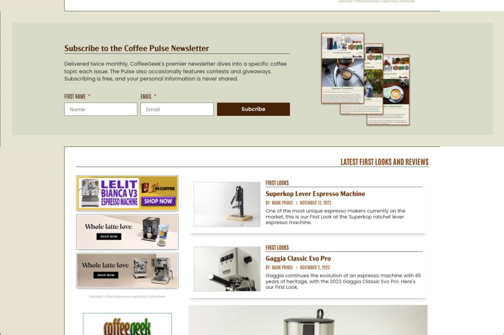 When my small team of five people completely overhauled the CoffeeGeek website in 2021, we faced a multi-page list of challenges to bring our website up to modern standards. Mobile accounted for nearly 40% of our traffic in 2020 (when the decision was made to update our website), but nothing about the pre-2021 version of CoffeeGeek was “mobile friendly”. We also made the decision to move from our own in-house CMS system (called WIPS, which still remains a very unique system) to a site based on WordPress (though highly customized). That meant losing two of our main community features: consumer product reviews, and our forums.