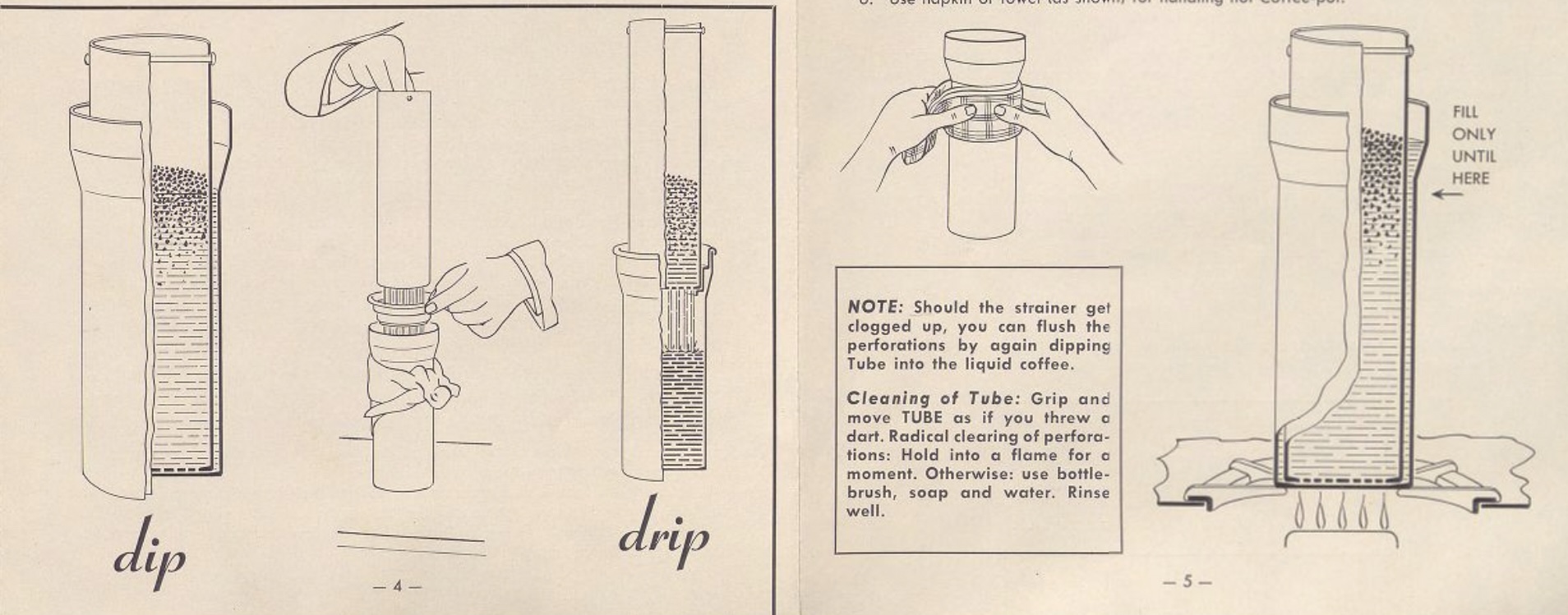 First, insert the smaller diameter tube with the bottom filter inside the larger, solid metal tube. Next, add coffee, and then add just-off-the-boil water. Let steep, then stir. After 2 minutes, lift the inner tube up (remember, it was metal and blazing hot, though it did have a catch handle to grasp), to let coffee begin to flow out the bottom. To aid in filtration, lift completely out of the larger tube, and then place the secondary filter device (they called it a “bushing”) to rest on the larger tube’s top opening, and place the inner tube on that to complete the filtration portion of the brew.