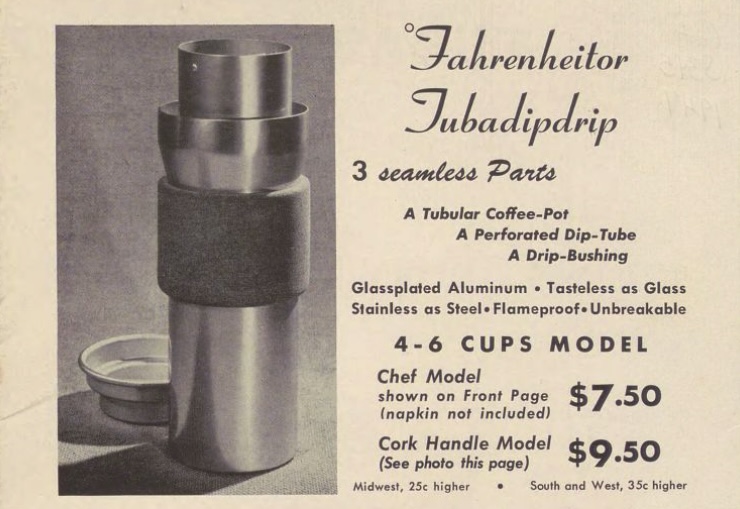 There was potential in the device, and I don’t quite know why the Chemex Doctor didn’t see it. He even alludes to it in the promotional literature of the time for the Tubadipdrip (Schlumbohm wrote all of his company’s promotional material and ads): he mentions “vacuum type” brew as one of the brew recipes for the Tubadipdrip.