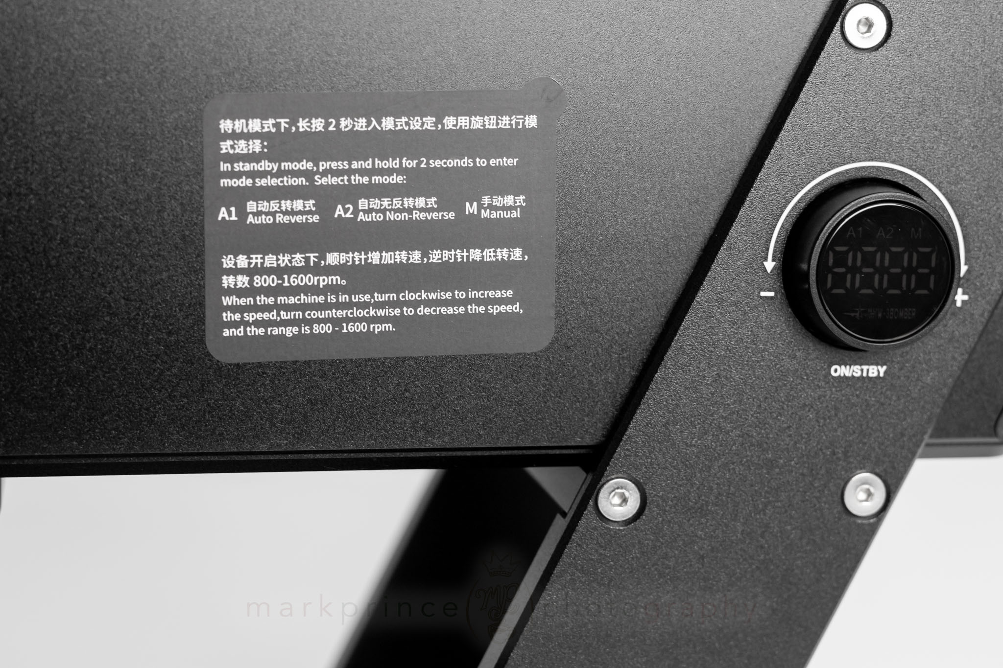 On the right side of the machine is the multi-function control dial, fronted by a bright LED display that shows the current RPMs and grinder mode. This is also how you access the F74’s three modes: just press the dial for two seconds, then rotate to pick your poison.