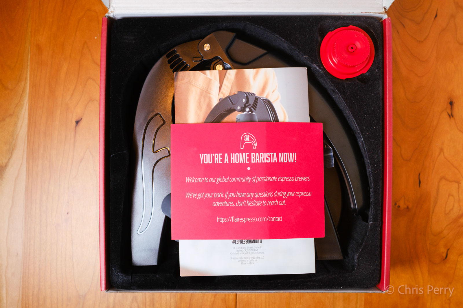 Upon opening it up, you’re greeted with a nice, bright red card that congratulates you on becoming a Home Barista, and offers to help with any questions that may arise during your “espresso adventures”. Flair makes it clear from the get go that they want you to be successful with their product, and are standing by to help you get the results you’re looking for. Under that card is a small booklet that lays out the contents, introduces the product, and explains how to get started brewing right away. It also offers a QR code that links to their quick start video brew guide.