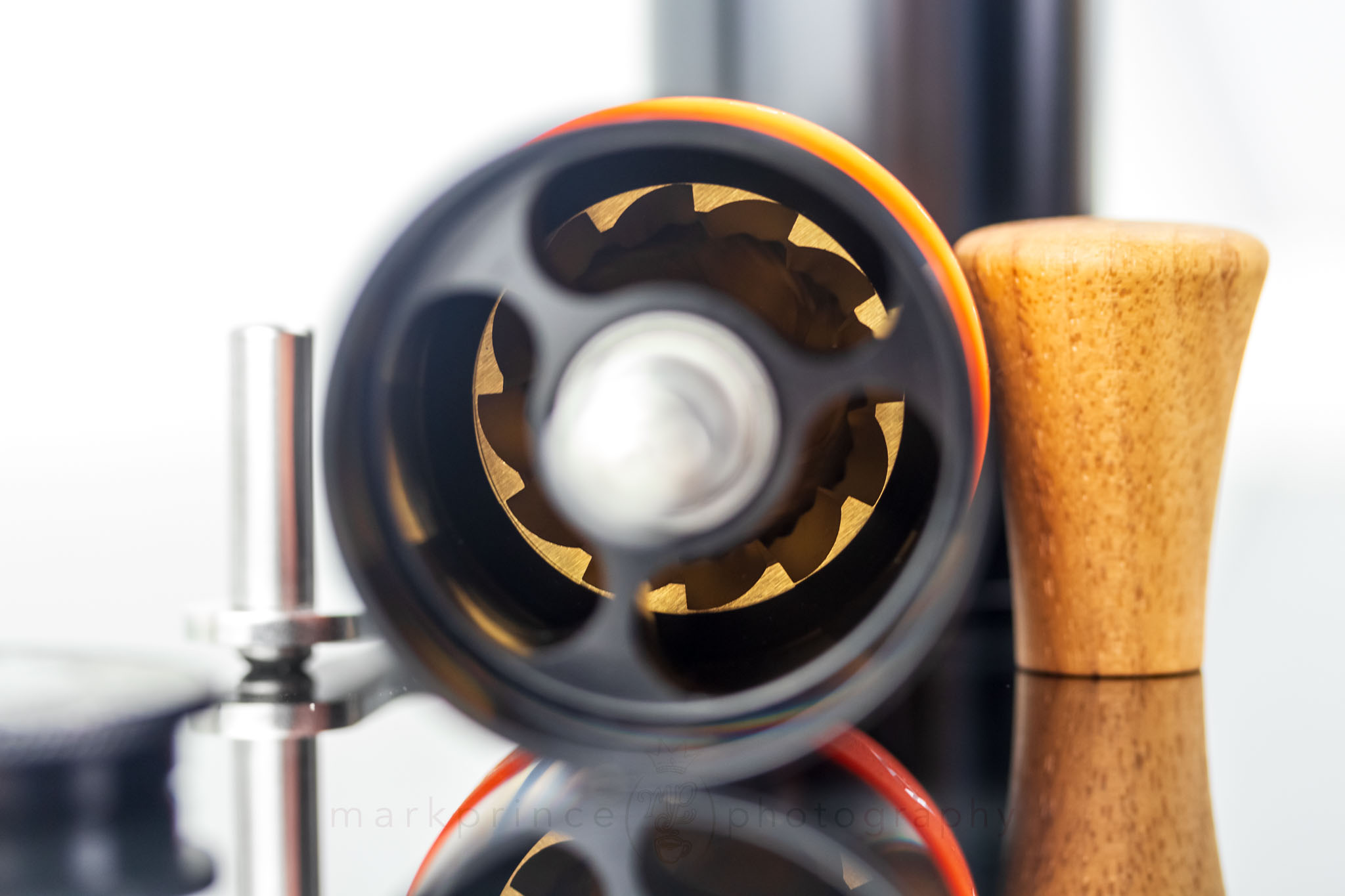 Snapping off the top cap reveals the heart of the Aergrind, a 38mm titanium-nitrided conical burr set made by Italian manufacturer Italmill. These burrs are hard-coated to last approximately four times longer than traditional hardened steel, and feature an aggressive tooth pattern that “grabs” beans quickly and feeds them through with minimal resistance.
