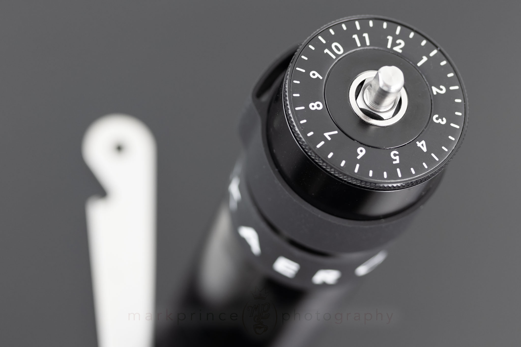 At the top, the metal grind adjustment cap snaps into place securely thanks to embedded magnets and features laser-etched grind setting numbers and ticks around a knurled outer ring. This stepless dial rotates smoothly over multiple full rotations to offer an impressively wide grind range.