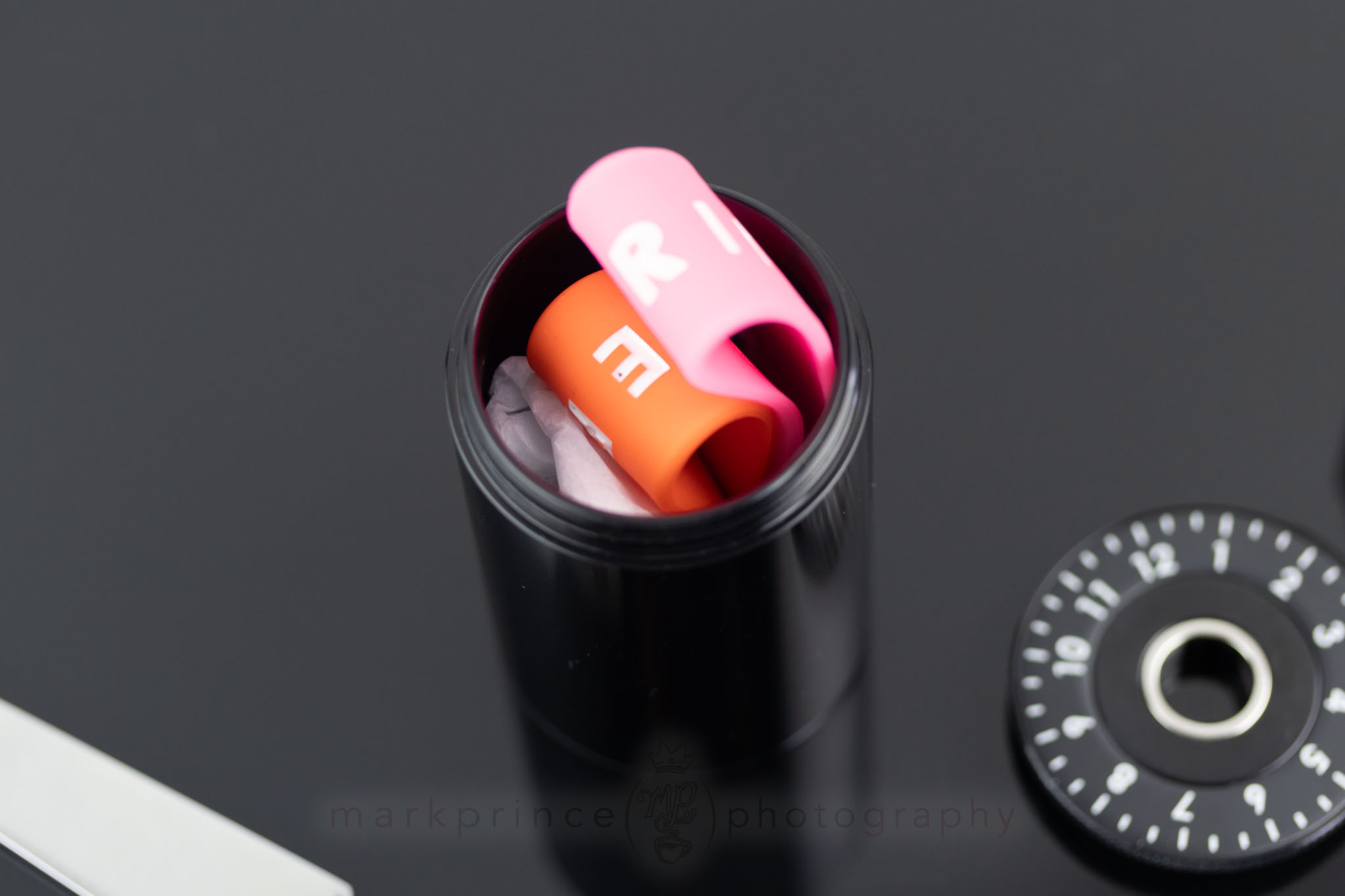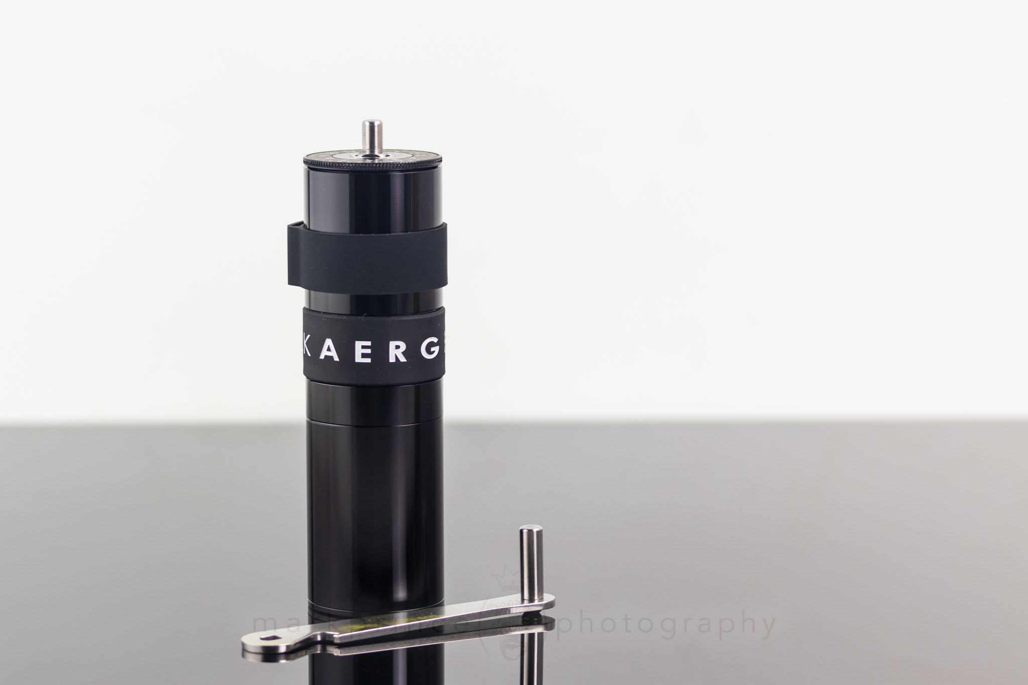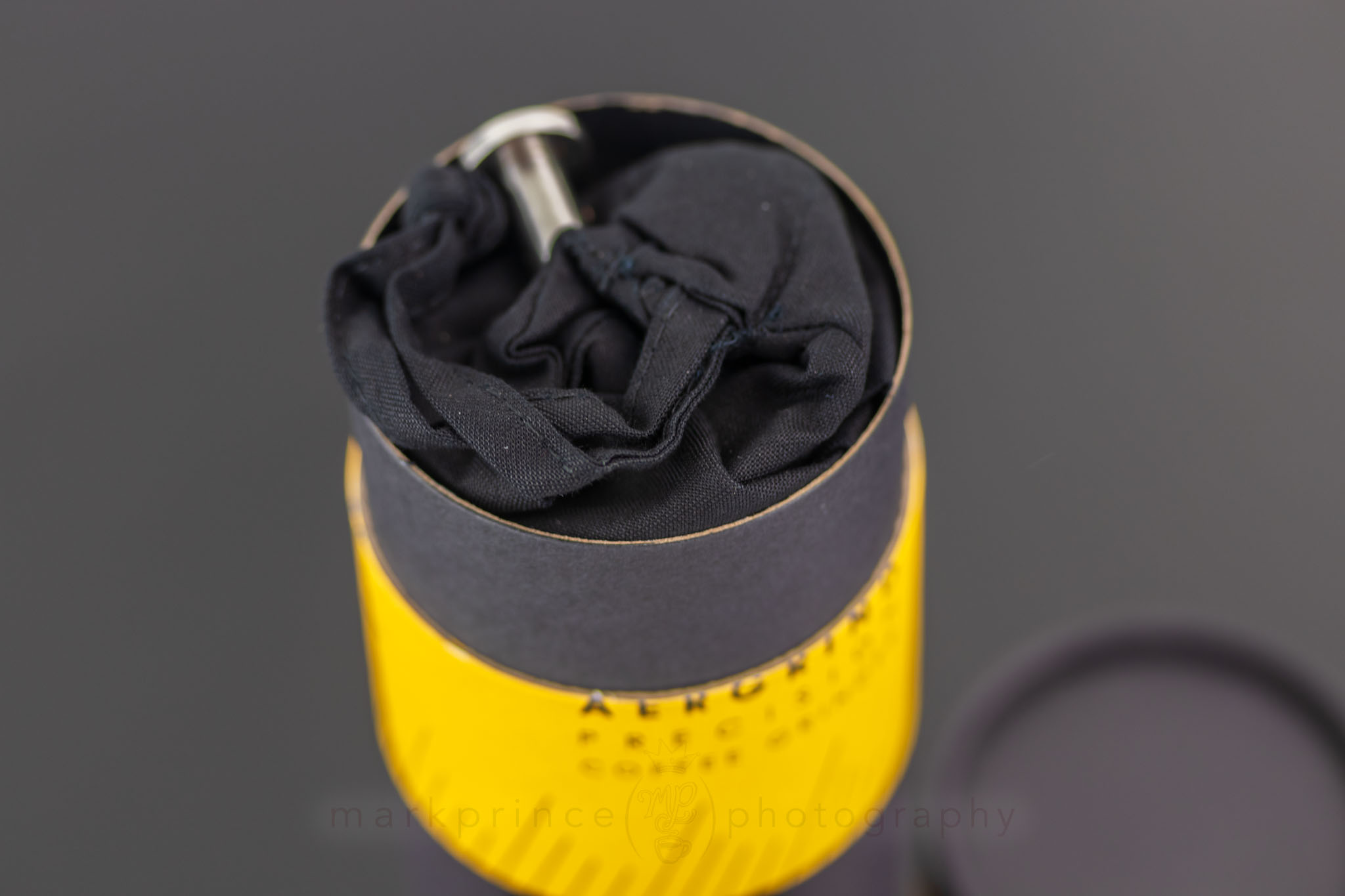 Inside the tube, the Aergrind sits inside a fibre sack, and arrives mostly assembled. The main body is already fitted with its signature black silicone grip collar, seated perfectly in the precise recess on the sleek anodized aluminum frame. It’s the kind of fit that makes you think this thing was engineered by folks who really geek out about details. There’s also a larger silicone ring, with a built in crank arm holder, attached, and this one is stretchy enough to fit the outer tube of an AeroPress, giving you storage space for the crank on the go.