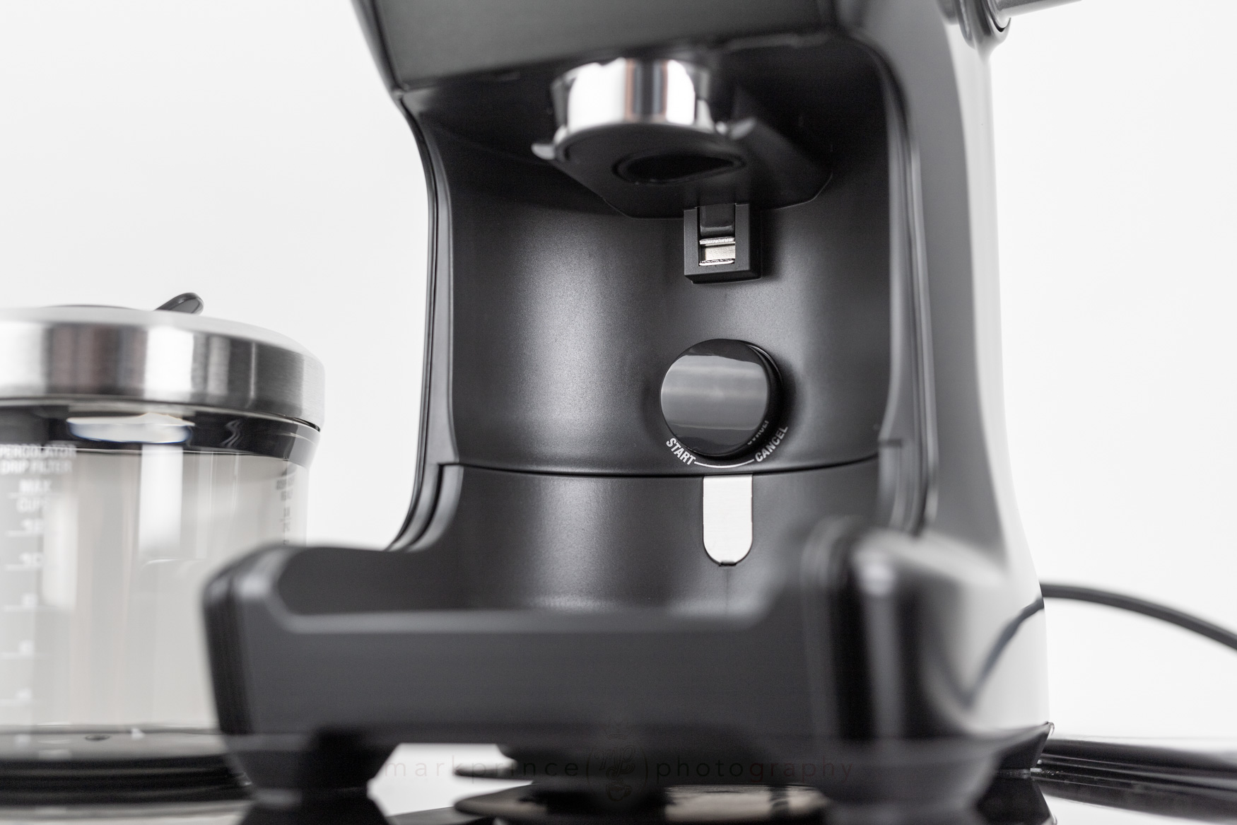 Moving further down, we come to the grinds bin / dosing fork area up front on the grinder. There’s a lot more going on here than meets the eye. First, there are built in sensors that know if you have the dosing forks for portafilters installed. Second, there’s a trigger button built into the back wall that can be activated via pressing your portafilter into it. This recessed button also works just like the front panel start / pause / cancel / manual button. Press and hold your portafilter to the button for manual, count-up-timer grinding. Press and release for timer grinding. Press during grinding to pause (for up to 10 seconds). Press and hold after pausing the grinder to cancel that timer session.