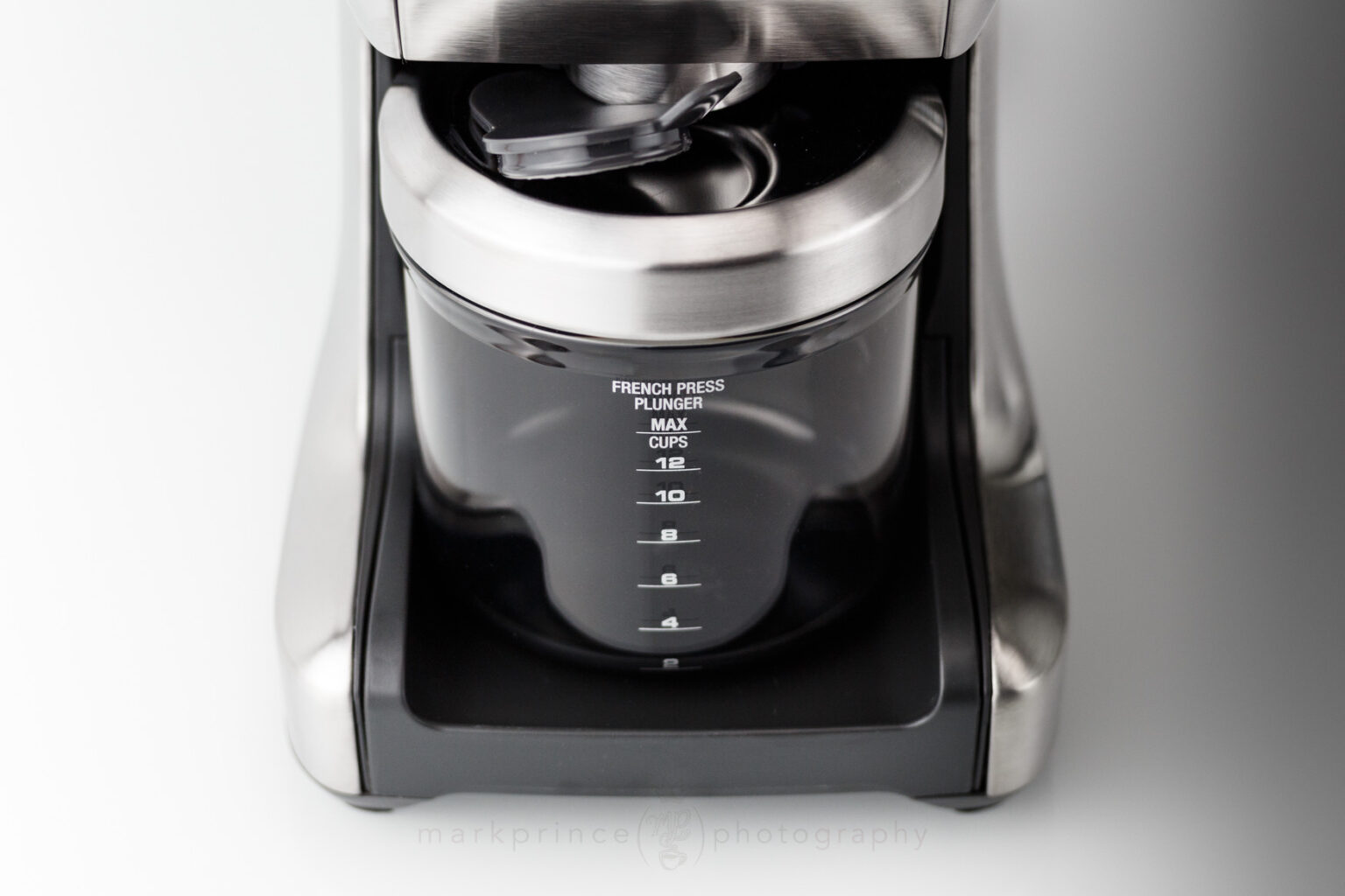 The first two have cup lines for 2, 4, 6, 8, 10, 12, and MAX cups, and the espresso side shows 2, 4, 6, 8, and MAX settings. The lines on each of the three sides of the bin are different heights too (plunger’s a bit taller than drip, because of the coarser grind.