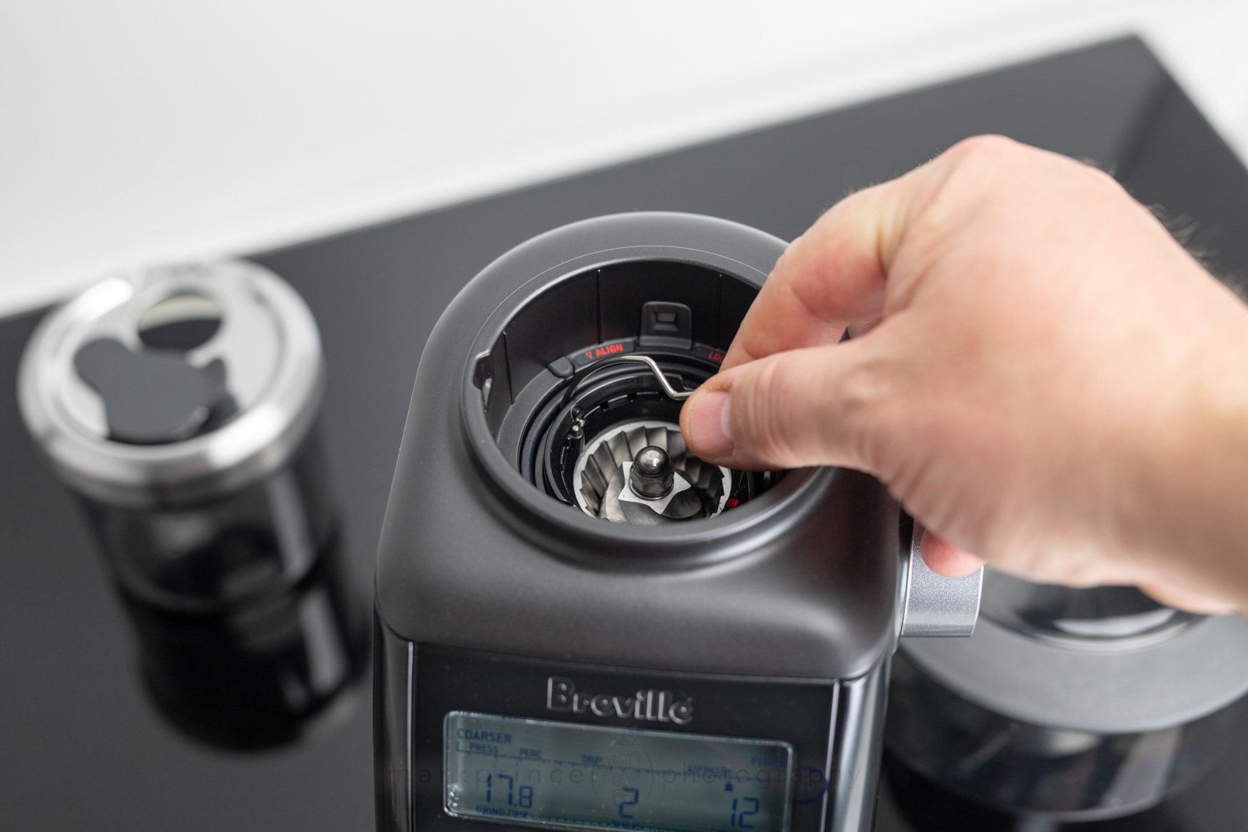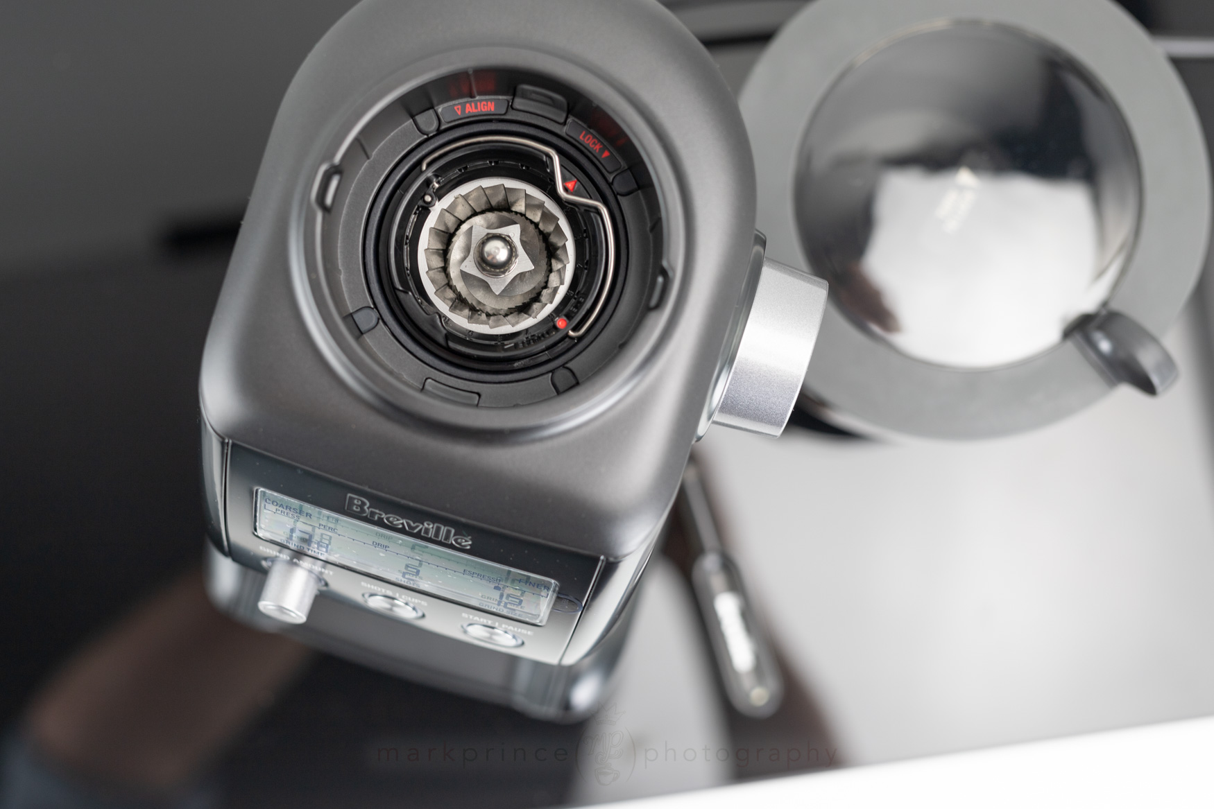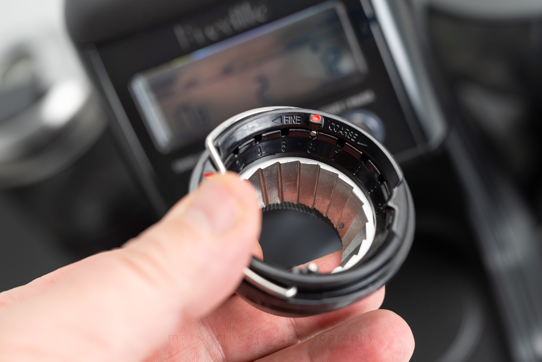 This burr carrier for the top burr is also one area of innovation in this grinder for Breville (and something they’ve carried on to most of their grinders since, including all their built in ones in their espresso machines): the burr can be adjusted (almost like shimming it, but without having to fiddle with shims) coarser or finer, to further adjust the grinder’s output. Out of the factory, it’s set at 5, but can be adjusted in 10 different steps.