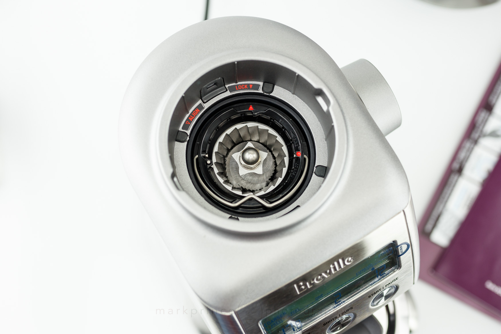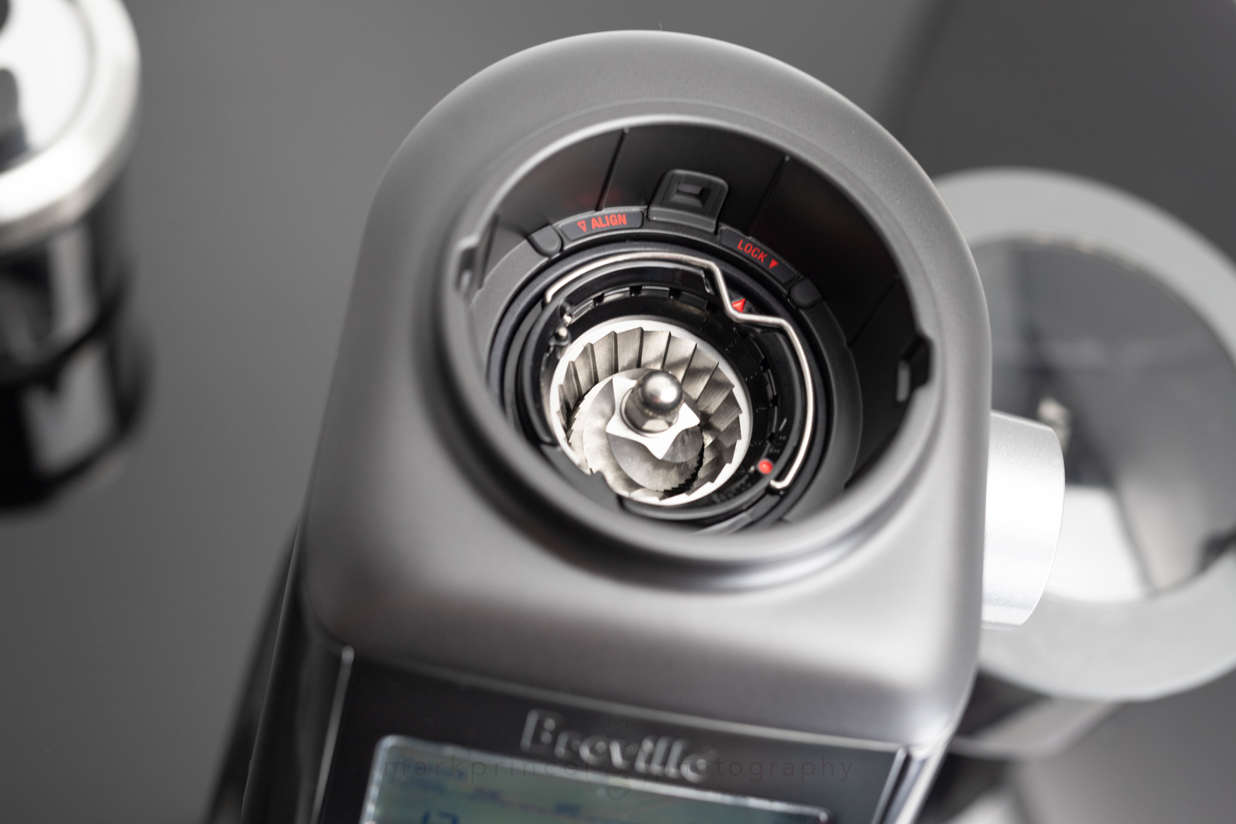 Removal of the bean hopper gives you a look at the burr group chamber. There is a stationary top carrier and burr which can be removed by lifting a metal handle, and rotating the burr carrier counter clockwise half a centimeter (it’s all well marked).