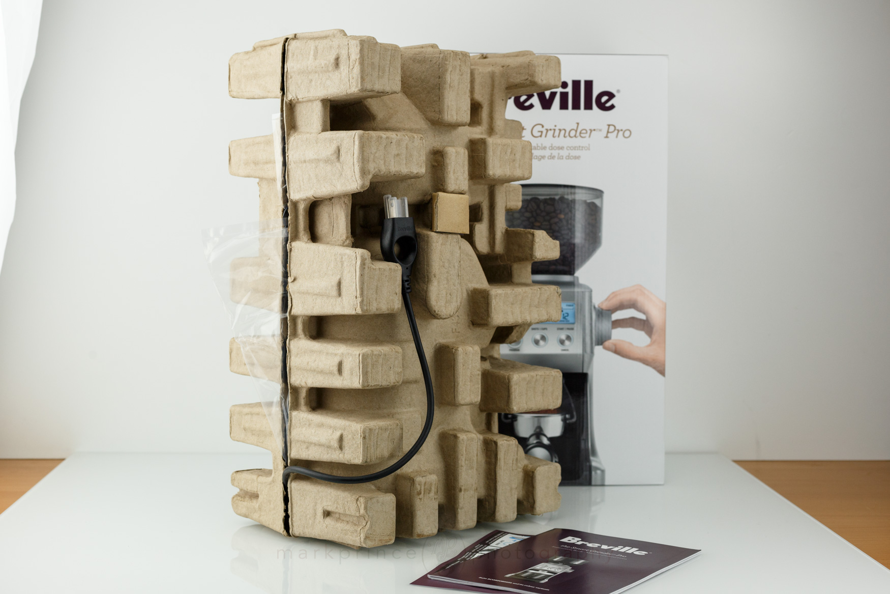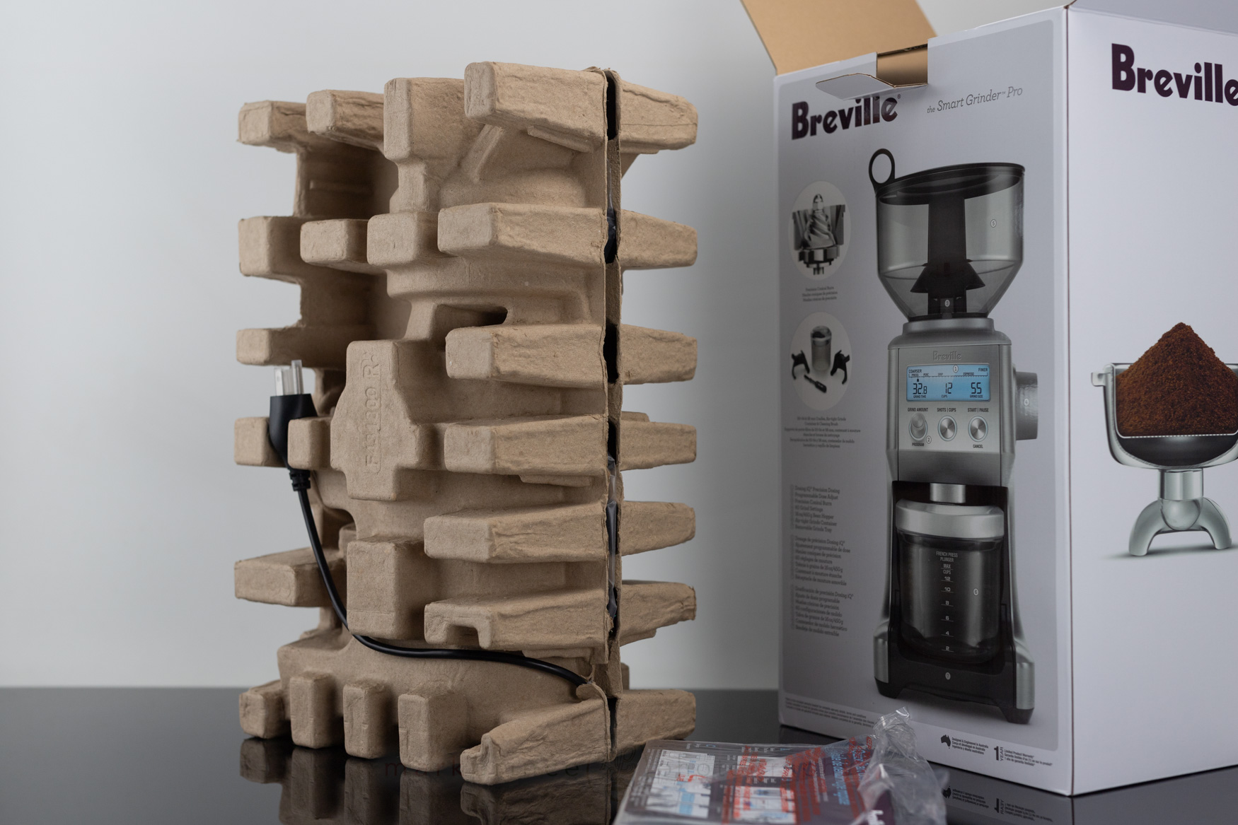 Like many Breville products, the Smart Grinder Pro is boxed in a flashy, graphics filled box that highlights all the product’s leading features. Unlike many Breville products, the Smart Grinder Pro is packaged (mostly) with environmentally friendly materials. There’s no styrofoam in this box; instead it uses a cardboard form to keep the product secure.