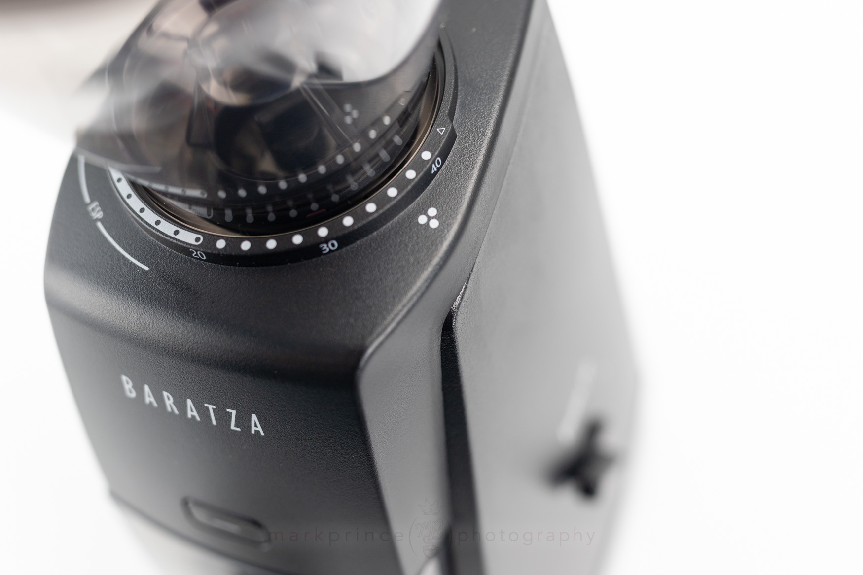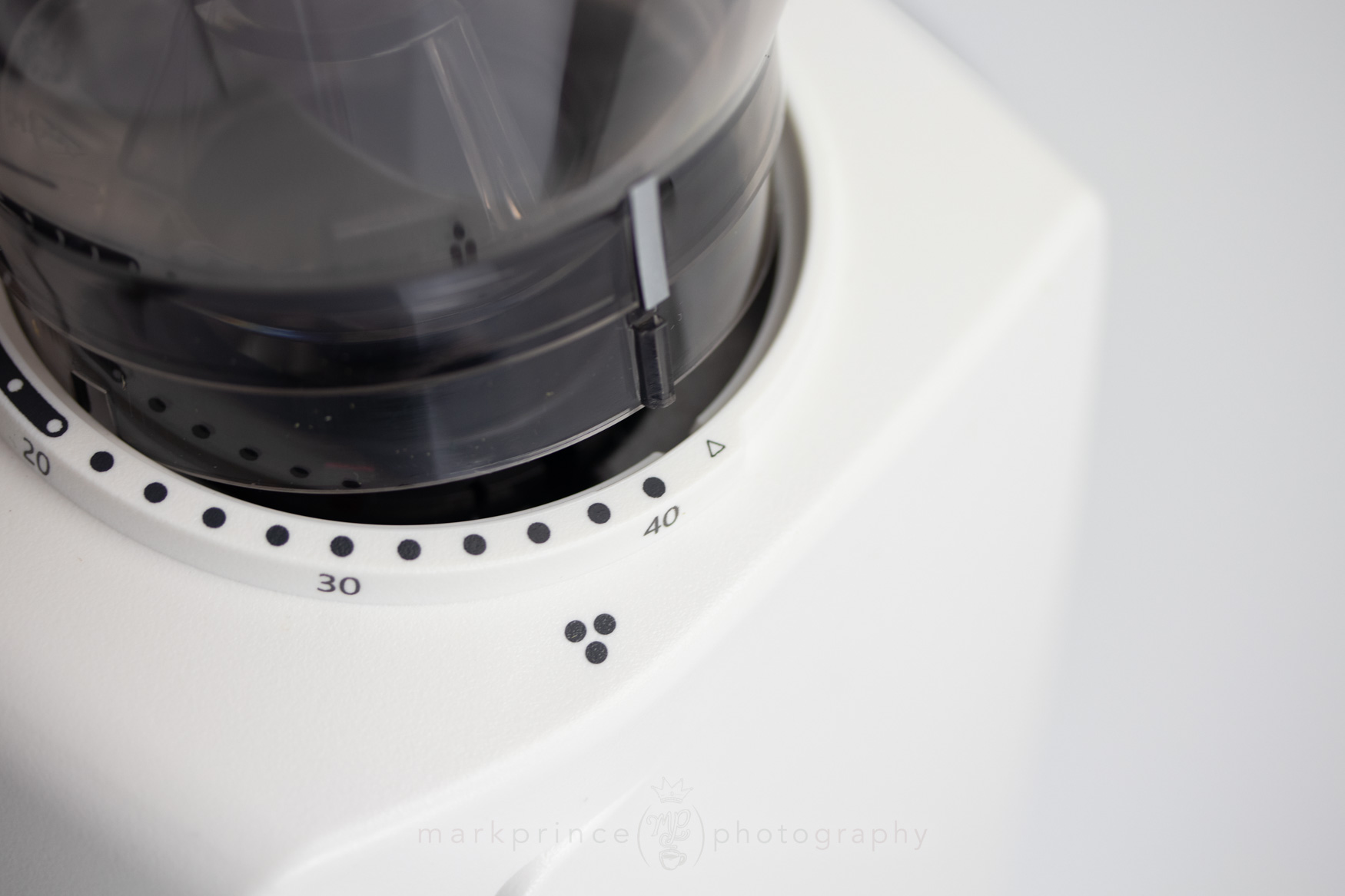 Up around the collar of the bean hopper are the grind selection indicators. There are 40 available clicks, with the first 20 dedicated to an espresso range, and the next 20 dedicated to AeroPress through Press Pot grinding.