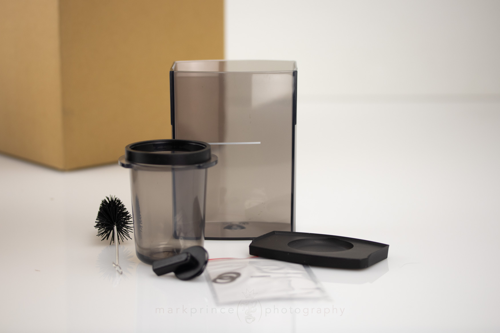 The dosing cup is designed for very small batch grinding for pour over (max capacity is around 25g), but mainly for espresso portafilter use. Out of the box, the dosing cup is fitted for 58mm portafilters, but it has a removable silicone sleeve that lets it work with smaller diameter 54mm machines.