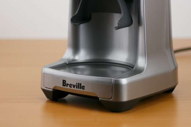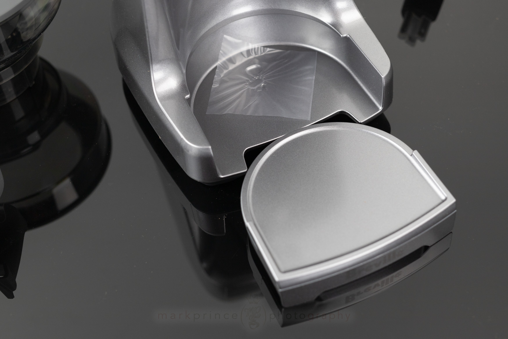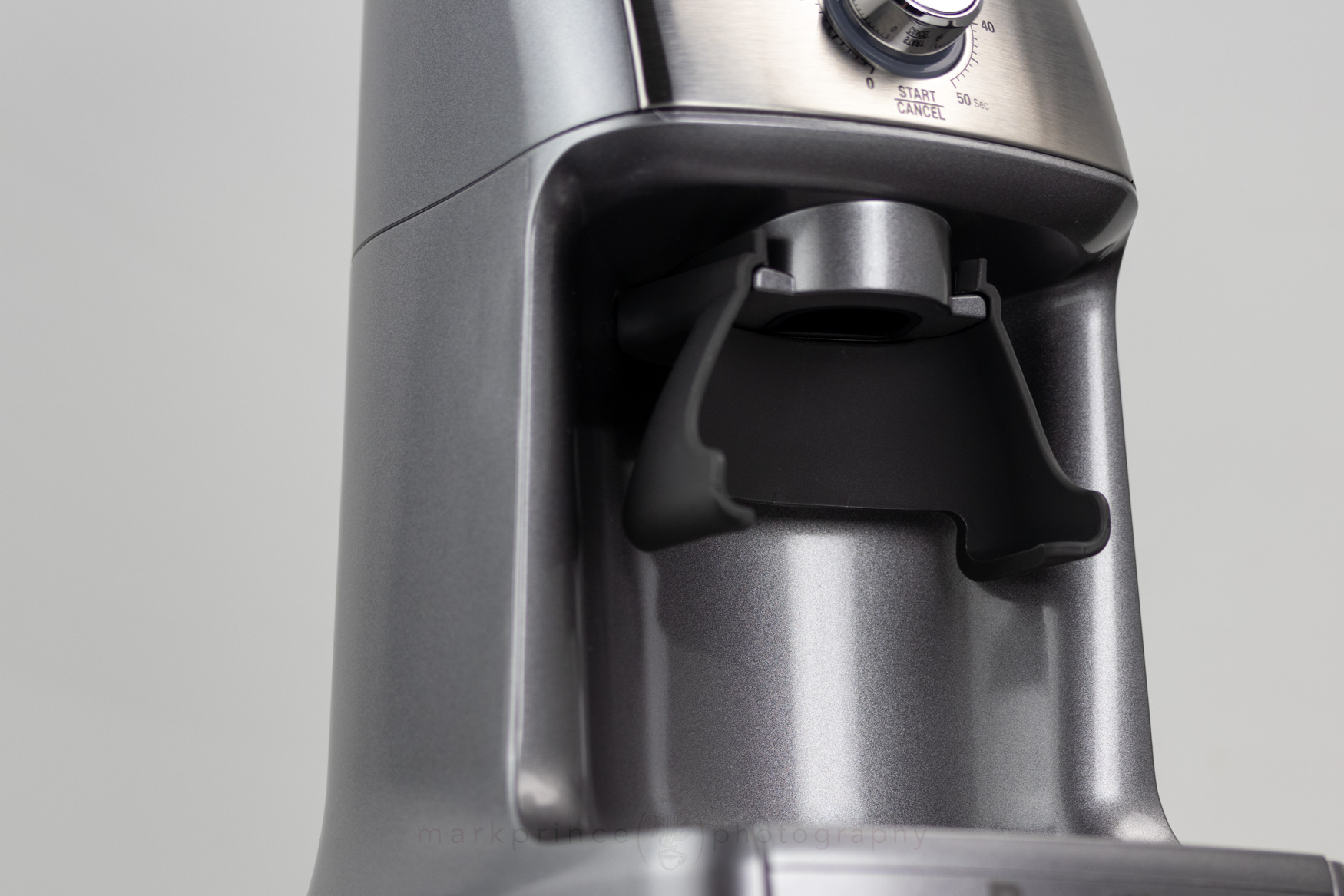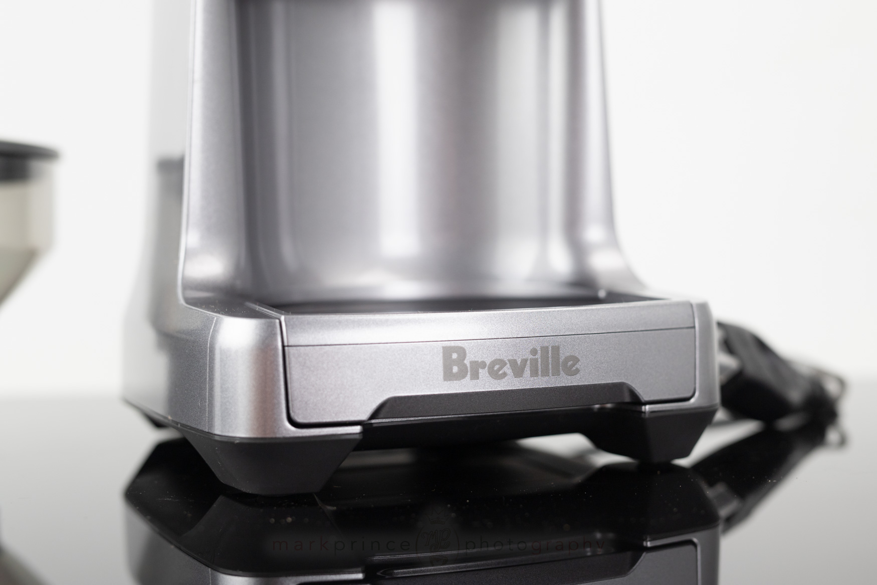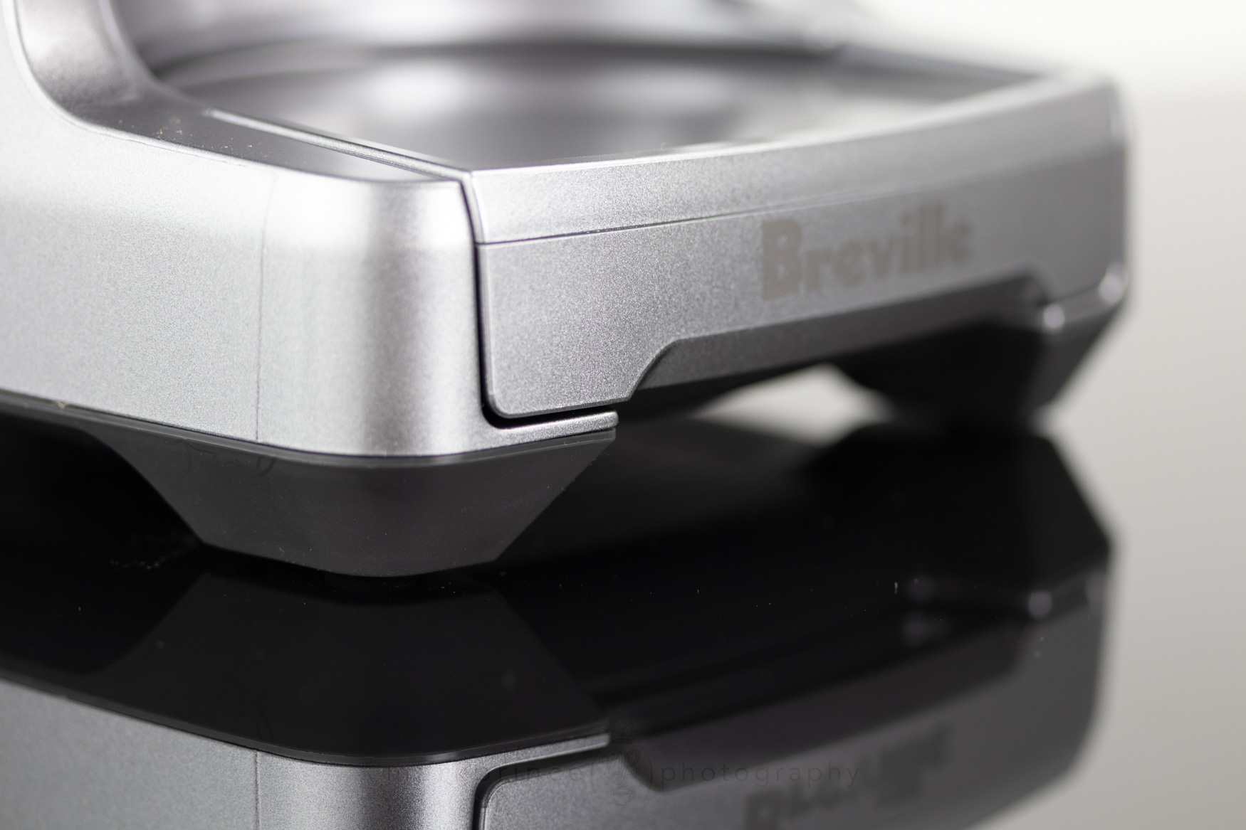 The grinder is mostly plastic. The body panels look like Breville’s signature brushed steel plating, but they are plastic. It’s all BPA free. The feet on this grinder are really great, gripping feet – no slipping with this grinder. It’s interesting though that Breville designed a “profile” for the bottom of the grinder that make it look like it sits on much bigger rubber feet than they actually do.
