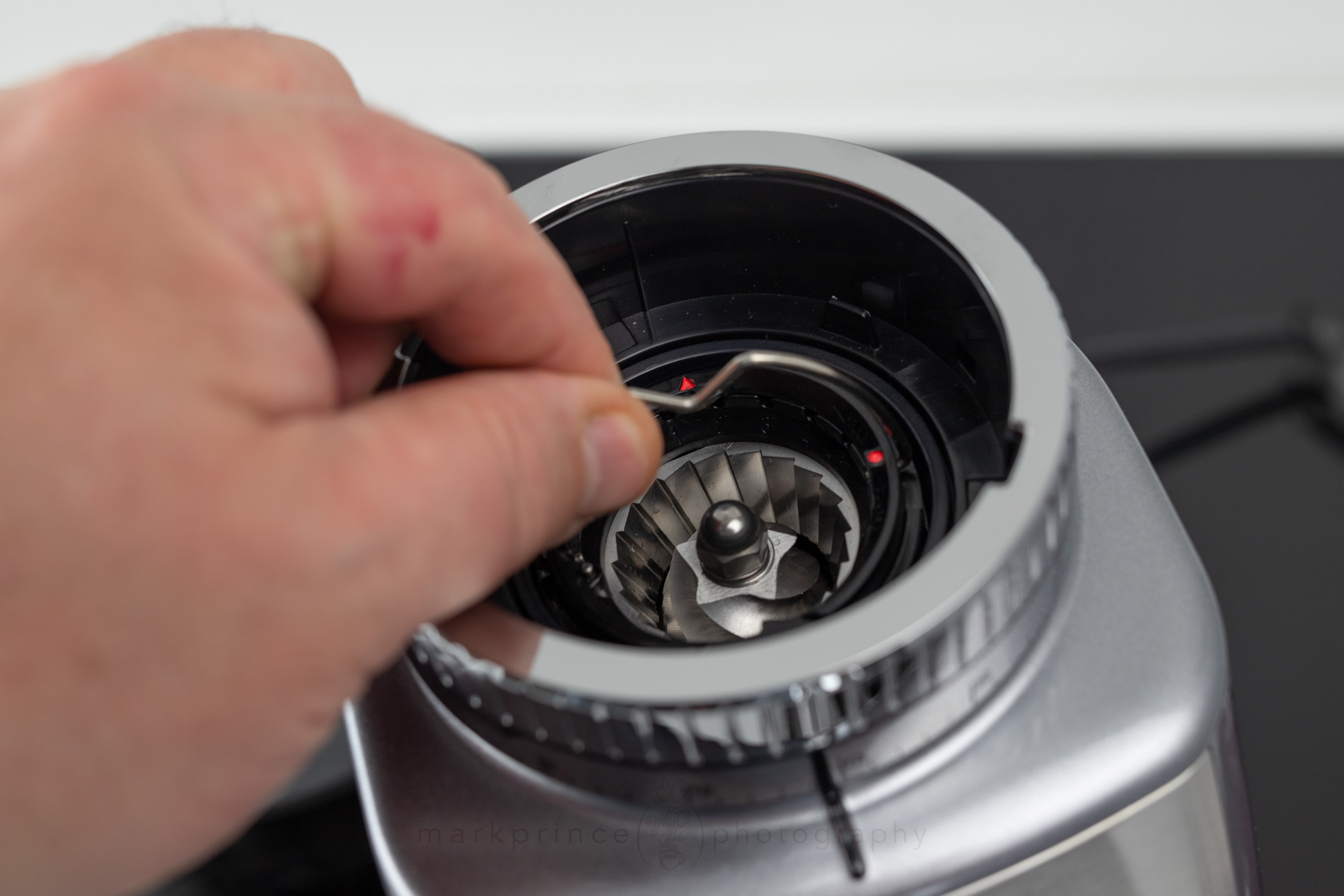 Breville innovated quite a bit with this grinder when they designed the burr housing for it. The grinder actually has about 600 different possible grind settings because of a rather ingenious internal adjustment you can do. Remove the bean hopper, to expose the burrs. You’ll see a little folding steel arm. Lift that, turn it (it might be hard to do because of residual coffee in the burrs) and you can pop out the upper burr ring.