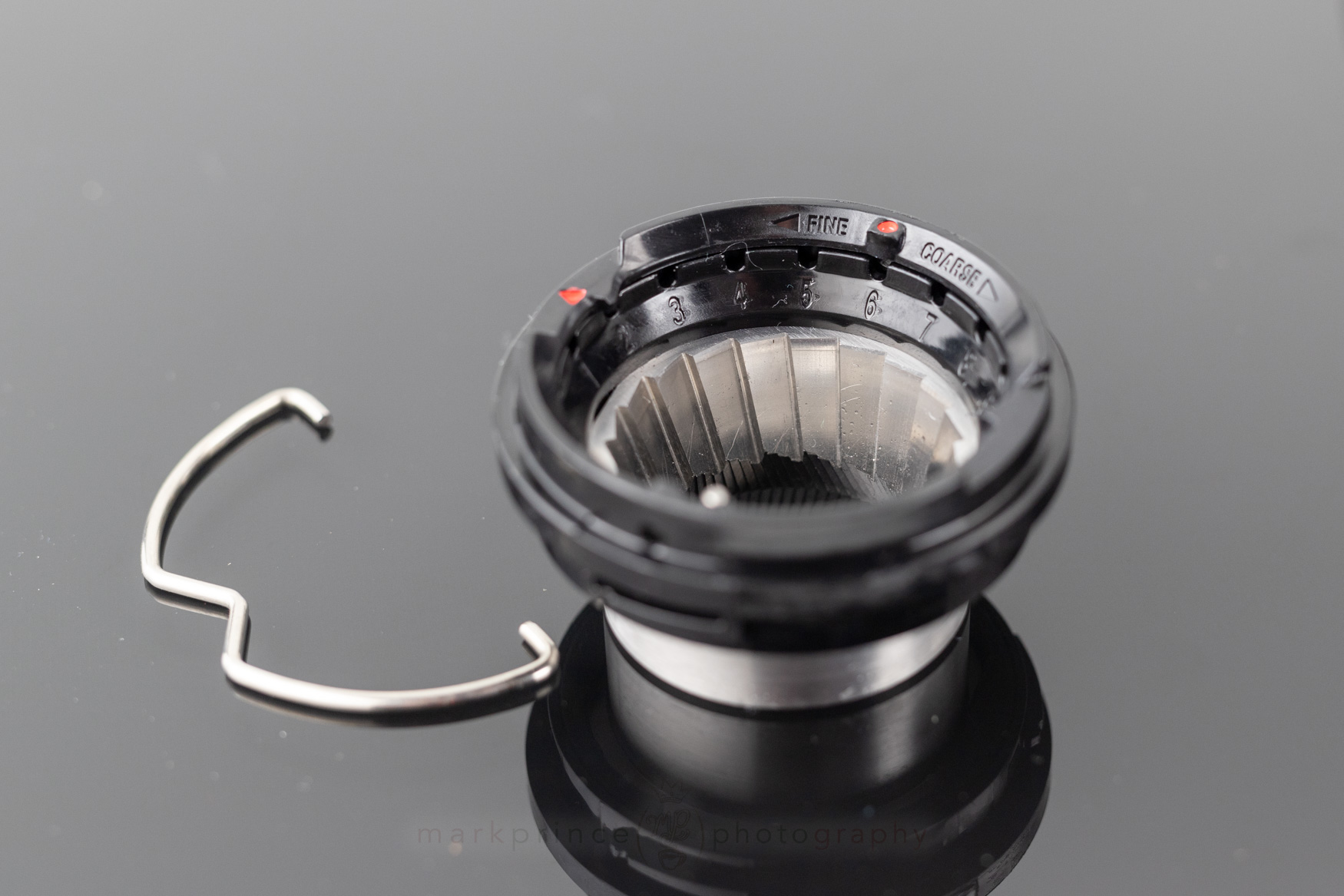 Then, you can remove the steel arm, and actually rotate the burr collar finer or coarser (they are marked on the burr set). Each “click” moves the burr housing up or down just a few microns, but it does have the effect of changing your grind levels across the 60 accessible settings. If you find you need more range on the espresso side, move the dial a bit finer. Want better press pot sizing? Go coarser. Re-assemble the metal clip, and put the burr group holder back into the grinder. Rotate it to lock into position (make sure everything is spotless before doing this – stray grinds will make this hard to do), and you now have 60 new settings on your grinder.