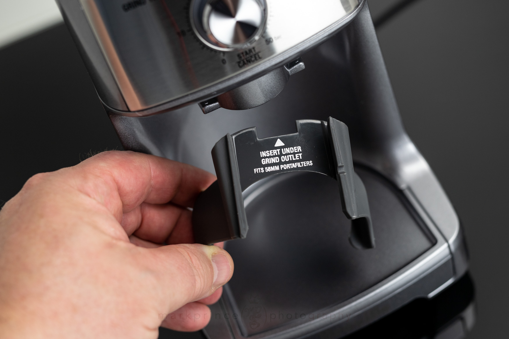 The grinder doesn’t come with a lot of stuff, but one thing is hidden inside the machine. It ships with two portafilter forks you attach to the grind exit chute collar: a 58mm sized fork, and a 53/54mm sized fork. The machine also ships with an adjustable-size, plastic version of Breville’s Razor device. I actually prefer this adjustable one over the all metal one that comes with their espresso machines.