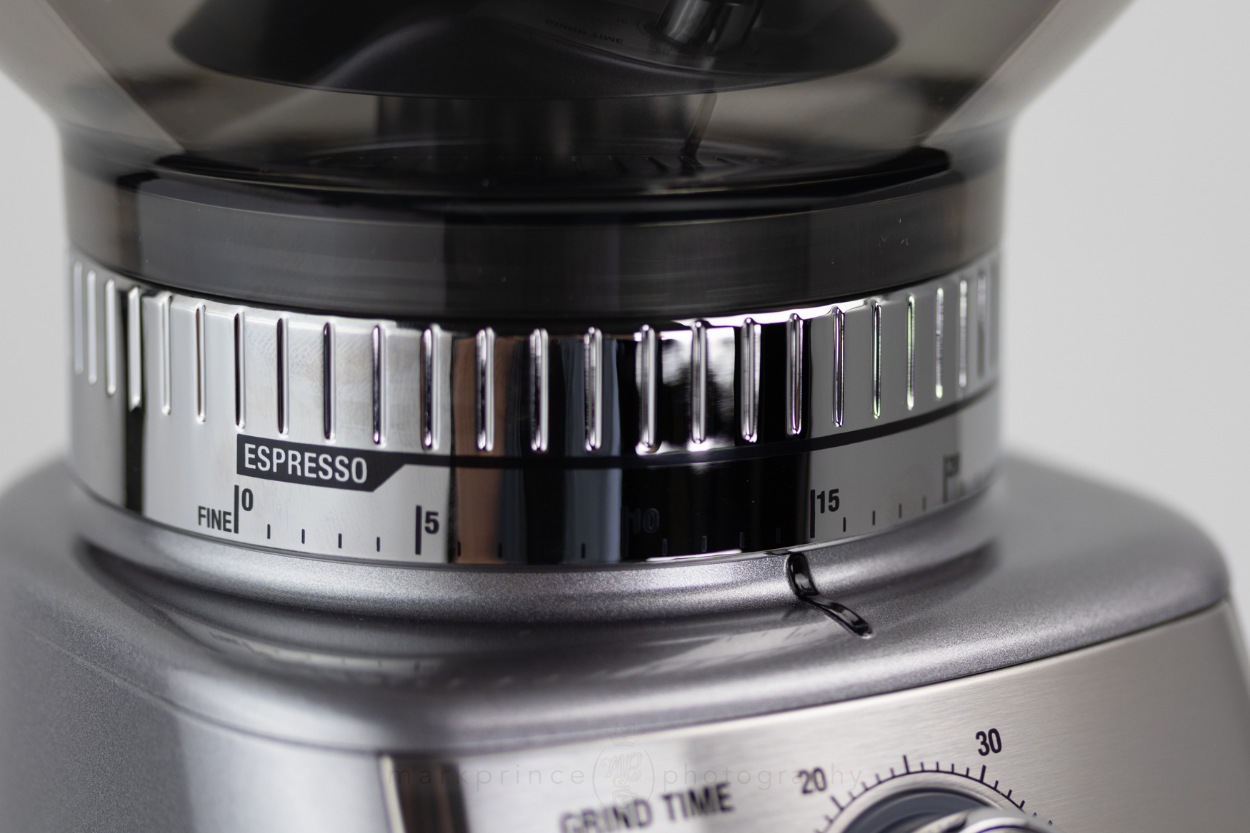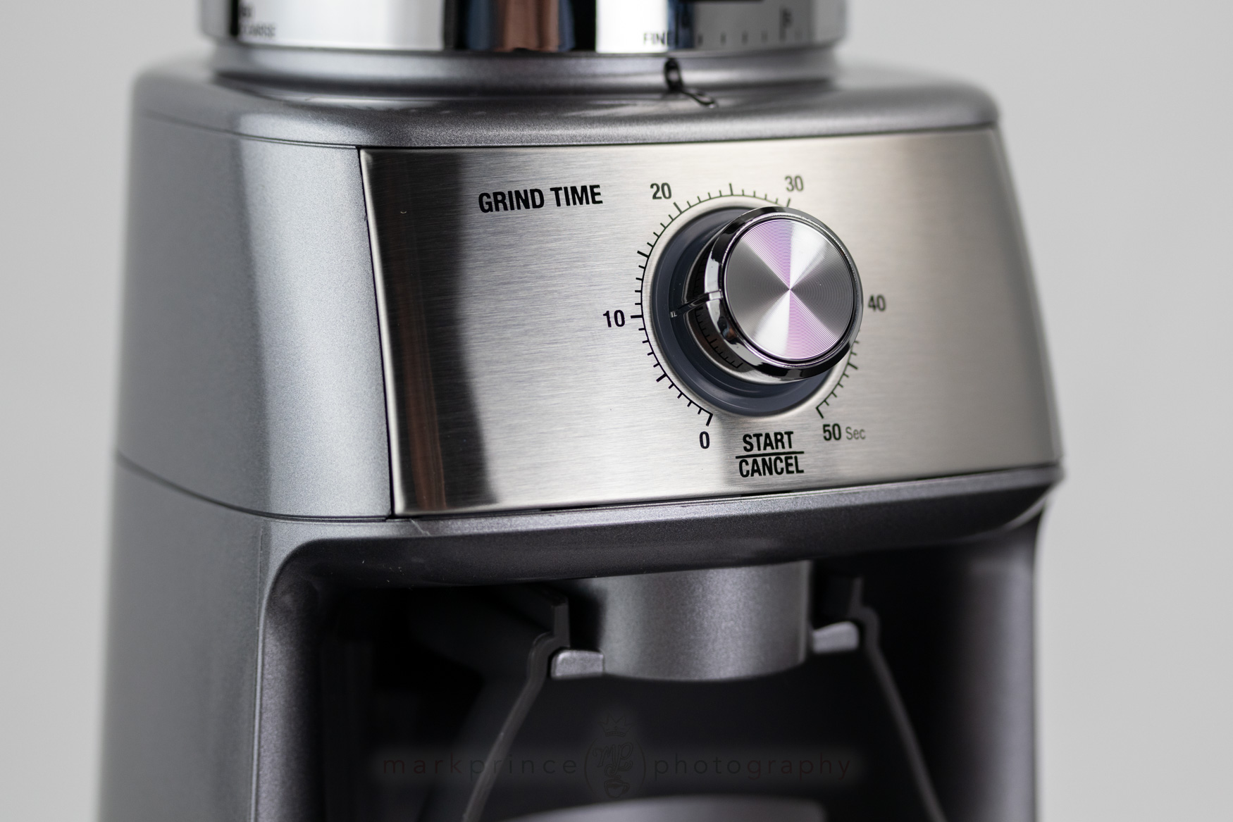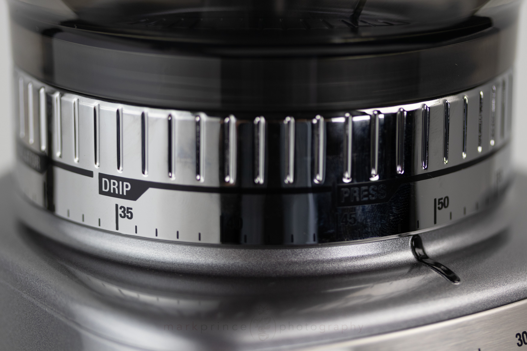 Looking over the machine, the controls are very basic. The main collar of the grinder has 60 clickable grind positions, going from fine espresso all the way to press pot, and the major zones (espresso, percolator, drip, press pot) are indicated on the dial.