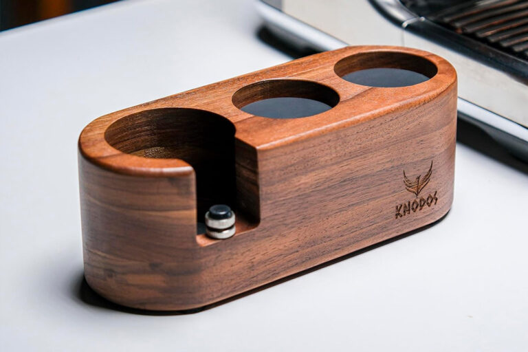The finish of the American Oak wood is excellent (our senior blog editor owns the 58mm version) and the stand has very grippy feet so it won’t slide around. The main tamper area has an adjustable knob rest height to accommodate different portafilter designs including aftermarket models, but this stand works best with Breville 54mm triple bayonet portafilters.
